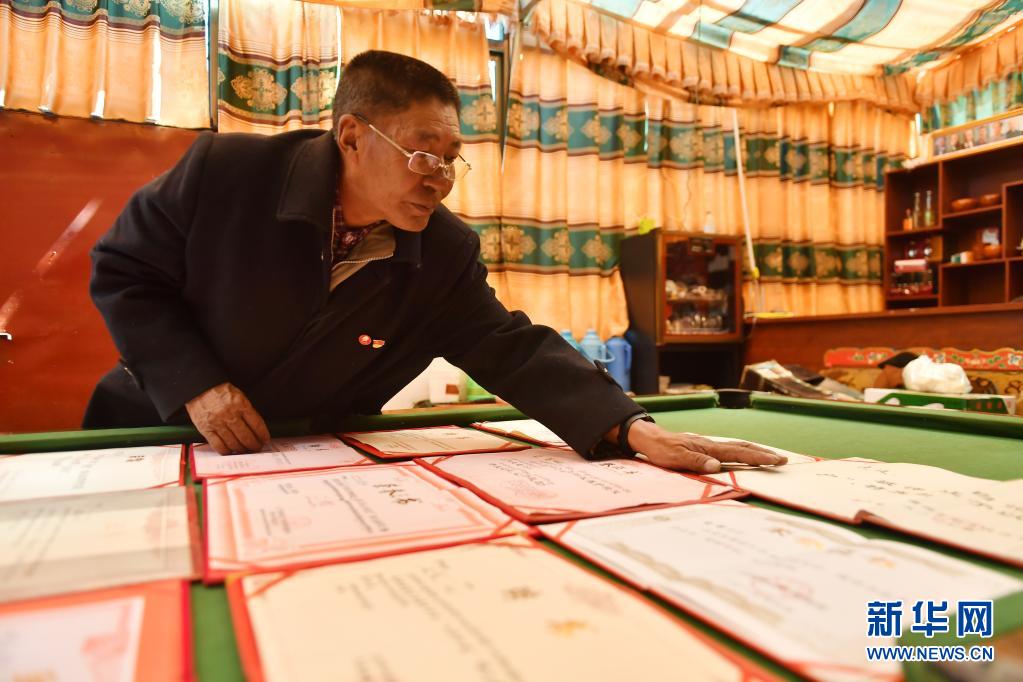 在西藏仲巴縣,邊瓊整理自己的榮譽證書(5月16日攝)。新華社記者 孫瑞博 攝