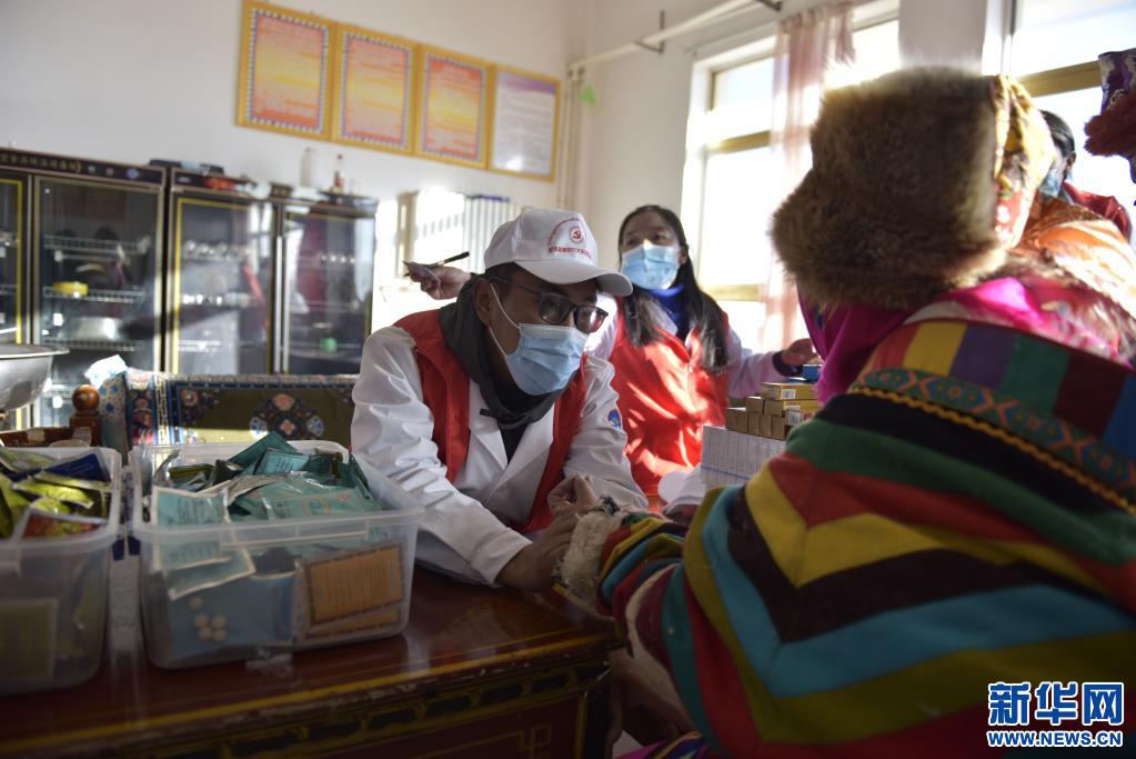 西藏尼瑪縣新時代文明實踐中心志愿者在尼瑪縣五保集中供養(yǎng)服務(wù)中心進行義診(2021年2月3日攝)。新華社記者 格桑朗杰 攝