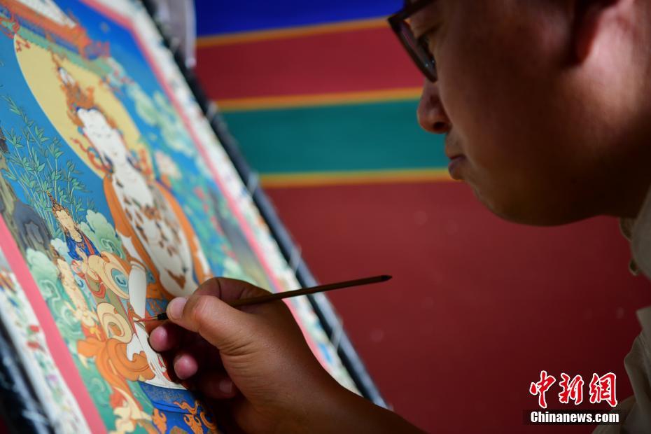 6月12日,2021年“文化和自然遺產(chǎn)日”西藏非遺展演展示系列活動(dòng)在拉薩舉行?;顒?dòng)現(xiàn)場(chǎng)融入了文藝演出、非遺展演、非遺產(chǎn)品展銷(xiāo)等內(nèi)容,市民游客可親身體驗(yàn)非遺產(chǎn)品的制作過(guò)程。圖為非遺傳承人在手繪唐卡?!?中新社記者 貢嘎來(lái)松 攝