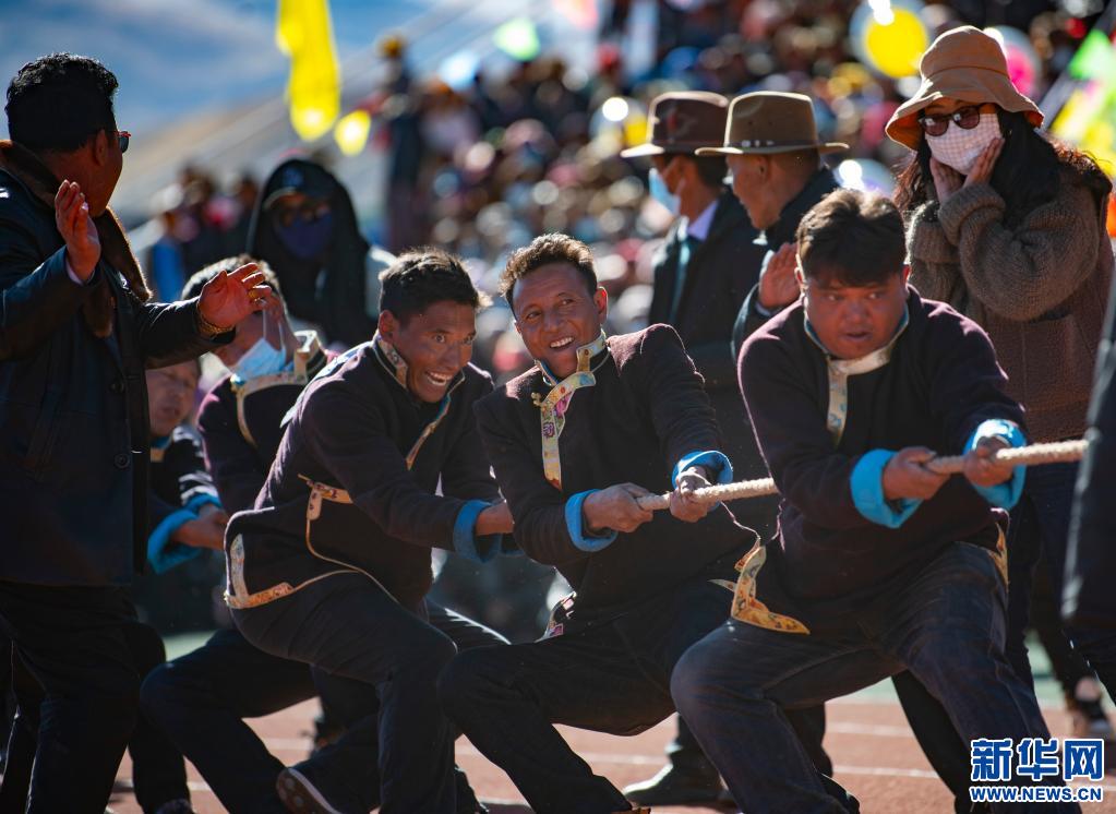 圖為2020年11月29日,山南市扎囊縣的農(nóng)牧民在該縣首屆農(nóng)民運(yùn)動會中參加拔河比賽,在農(nóng)閑期間參與全民健身的現(xiàn)場。新華社記者 普布扎西 攝