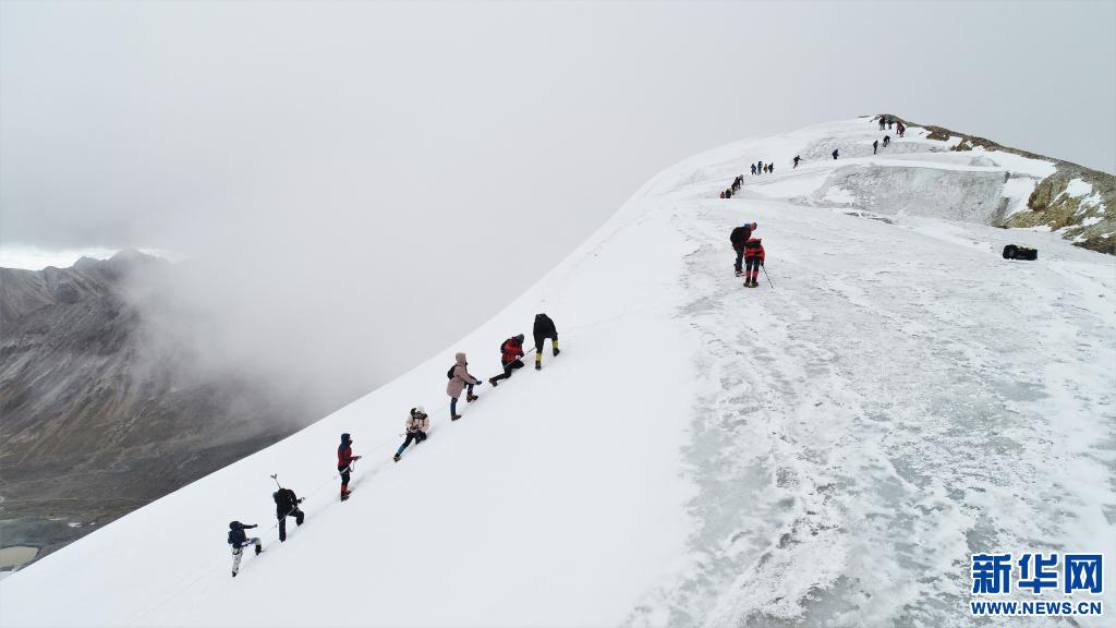 2020年10月5日,第十八屆“第三極”中國西藏登山大會上登山愛好者在向洛堆峰峰頂進(jìn)發(fā)(無人機(jī)拍攝)新華社記者 孫非 攝