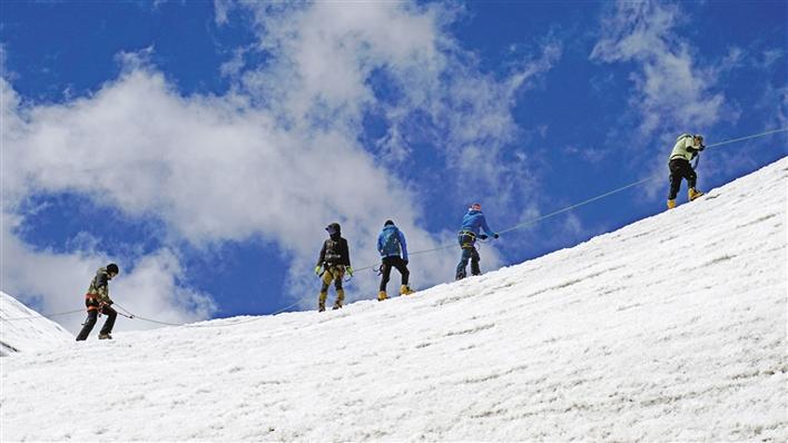 壓題圖片為洛堆峰登山探險活動中,登山愛好者在5400米雪線處進行冰雪和登山技術訓練。記者 鄭璐 張姝 攝