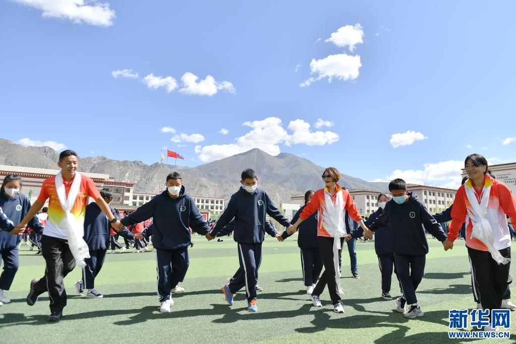 6月25日,跳水奧運(yùn)冠軍高敏(前右三),西藏和平解放以來首個(gè)競技體育世界冠軍、摔跤運(yùn)動(dòng)員西洛卓瑪(前右一)和成功登頂七大洲最高峰并徒步到達(dá)南北極點(diǎn)的西藏登山運(yùn)動(dòng)員德慶歐珠(前左一)在拉薩市阿里高級(jí)中學(xué)和學(xué)生們一起跳鍋莊課間操。新華社記者 孫瑞博 攝