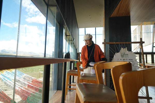 從正門進入,穿過牦牛文化空間走廊,便可到能夠以最佳視角欣賞念青唐古拉山的VR觀景臺。緊鄰觀景臺右側(cè),是一間擺放當?shù)匚膭?chuàng)產(chǎn)品、各類書籍的觀景咖啡廳。該咖啡廳的兩面墻體設(shè)計為超大落地窗,在此休息的游客可以邊品嘗咖啡,邊欣賞念青唐古拉山及拉多草原的美景。走進咖啡廳,記者看到不少在這里休息的游客都在低頭寫著什么,經(jīng)咖啡廳負責人介紹:“這些游客是在寫明信片,我們這里不僅提供餐飲,還提供印有本地風景的明信片,并同中國郵政合作,幫助游客按時將明信片寄到他們的親朋好友手中,讓游客們的旅途變得更有意義?!?/p>