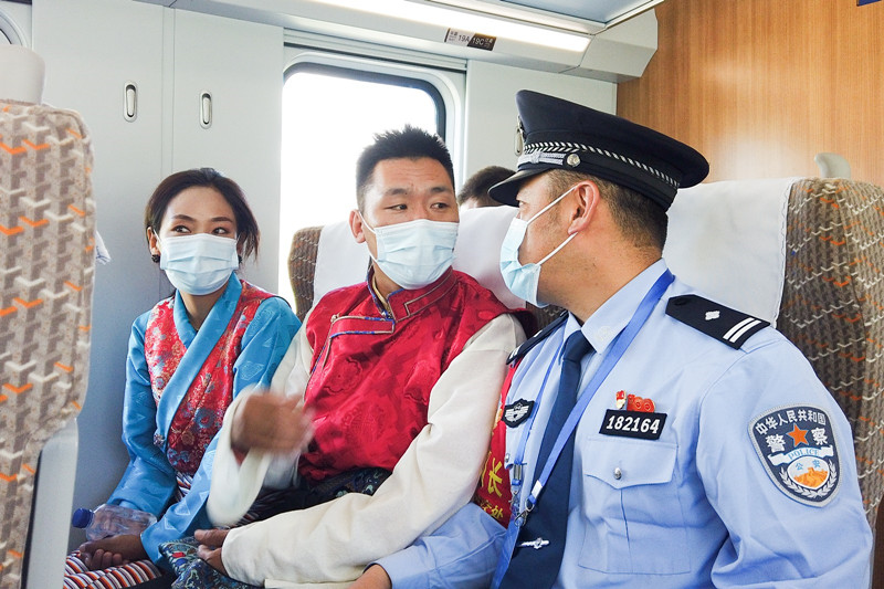 拉薩鐵路公安處乘警支隊(duì)民警在“復(fù)興號(hào)”動(dòng)車組開展值乘工作。胡傳鑫 攝