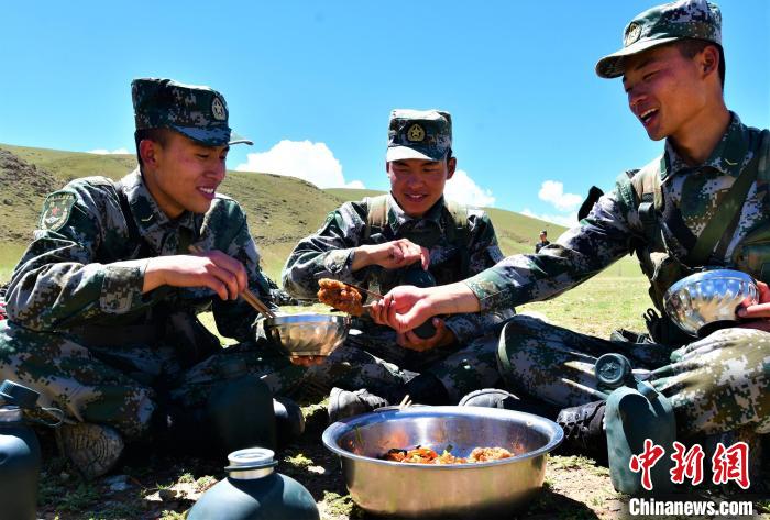 圖為西藏軍區(qū)某合成旅野外拉練官兵野餐現(xiàn)場(chǎng)。萬玲 攝