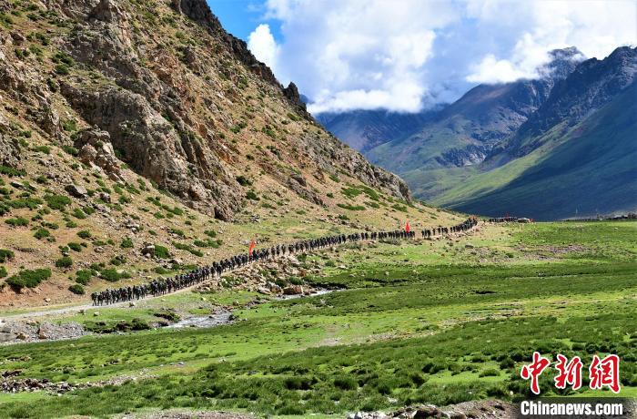 圖為西藏軍區(qū)某合成旅在野外拉練,隊(duì)伍負(fù)重前行。念美多杰 攝
