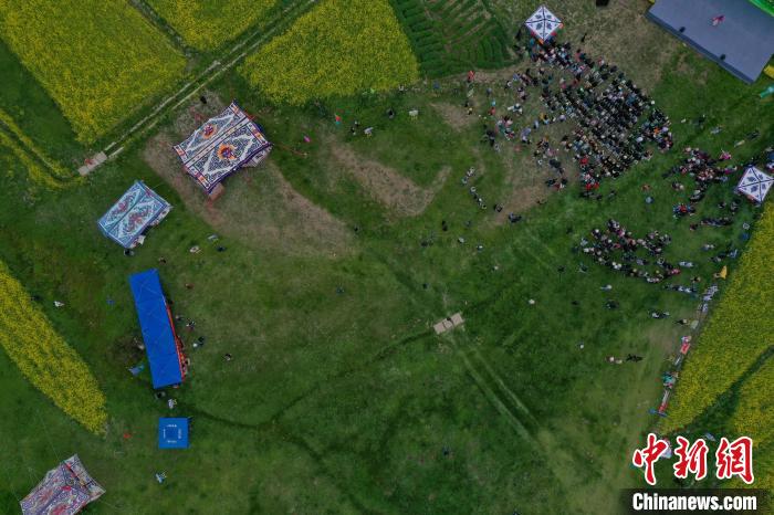圖為西藏自治區(qū)拉薩市墨竹工卡縣小油菜花文化旅游節(jié)現(xiàn)場(chǎng)。(無人機(jī)拍照)貢嘎來松 攝