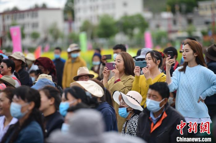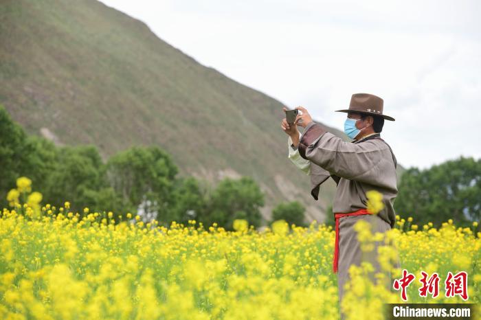 圖為西藏自治區(qū)拉薩市墨竹工卡縣小油菜花文化旅游節(jié)現(xiàn)場(chǎng)游客拿出手機(jī)拍攝節(jié)目。貢嘎來松 攝