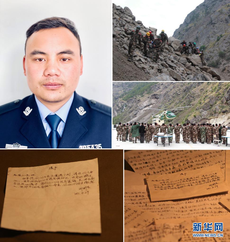 這是一張拼版照片:左上圖為共產(chǎn)黨員、邊防戰(zhàn)士邵明貴;右上圖和右中圖為邵明貴和戰(zhàn)友在轉(zhuǎn)移地震受災(zāi)群眾;左下圖為邵明貴寫下的遺書;右下圖為吉隆邊防檢查站邊防戰(zhàn)士寫下的遺書(資料照片)。新華社發(fā)