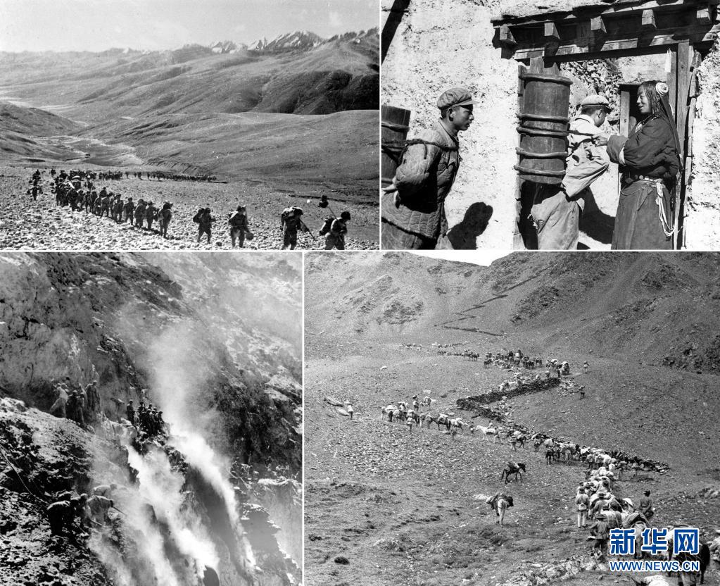 這是一張拼版照片:左上圖為1950年,人民解放軍戰(zhàn)士跋涉在高山峻嶺間向西藏前進(資料照片);右上圖為人民解放軍戰(zhàn)士在執(zhí)勤空隙為藏族老百姓背水(資料照片,張正模攝);左下圖為筑路戰(zhàn)士在懸崖絕壁上修建川藏公路(資料照片);右下圖為1951年7月,解放軍第十八軍進藏先遣部隊行進在瓦合山上(新華社記者袁克忠攝)。新華社發(fā)