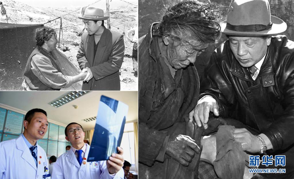 這是一張拼版照片:左上圖為來自陜西的援藏干部、阿里日土縣副縣長賈冗勇深入牧區(qū),幫助藏族牧民解決生產(chǎn)、生活的實際困難(新華社記者土登攝,1997年11月11日發(fā));左下圖為2017年8月3日,北京積水潭醫(yī)院援藏醫(yī)生龔曉峰(右)和北京天壇醫(yī)院援藏醫(yī)生李家謀在拉薩市人民醫(yī)院骨科病房內(nèi)查看患者的X光片,進行工作交接(新華社記者晉美多吉攝);右圖為孔繁森(右)在阿里日土縣過巴鄉(xiāng)為孤寡老人益西卓瑪治?。ㄐ氯A社記者土登攝,1994年12月26日發(fā))。新華社發(fā)