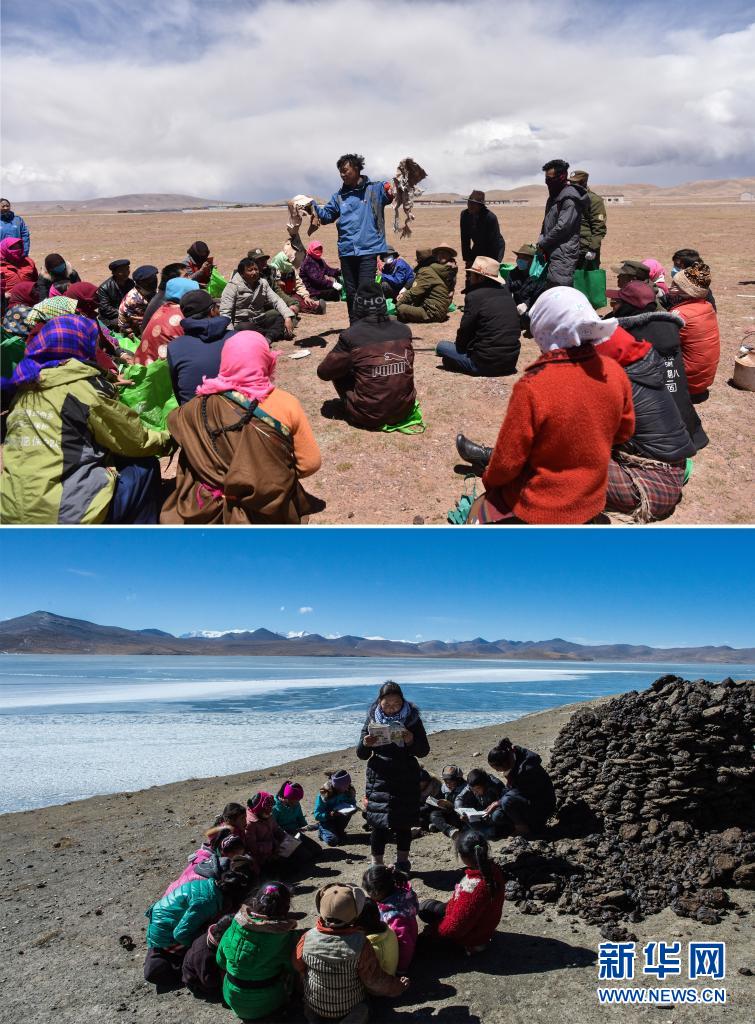 這是一張拼版照片:上圖為瑪曲鄉(xiāng)黨委書記朗卡江村(中)向參加活動的村民講解如何區(qū)分可回收垃圾與不可回收垃圾(2019年5月28日攝,新華社記者周錦帥攝);下圖為在海拔約5000米的西藏山南市浪卡子縣堆瓦村,駐村工作隊員貢曲(中)和次仁倉決(右一)給放假的孩子補習功課(2017年2月9日攝,新華社記者普布扎西攝)。新華社發(fā)