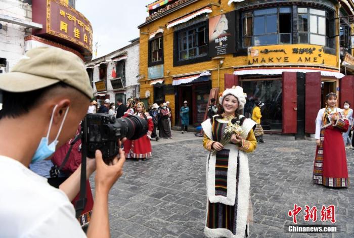 圖為7月24日,游客穿上藏族傳統(tǒng)服飾在拉薩市八廓街拍照留念。中新社記者 貢嘎來松 攝