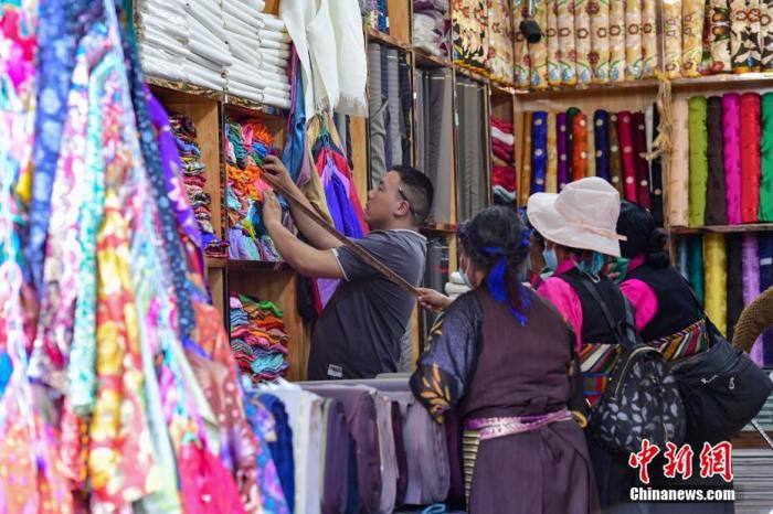 圖為7月24日,幾位藏族婦女在拉薩老城區(qū)八廓街上的藏裝店內(nèi)選購藏裝。中新社記者 貢嘎來松 攝