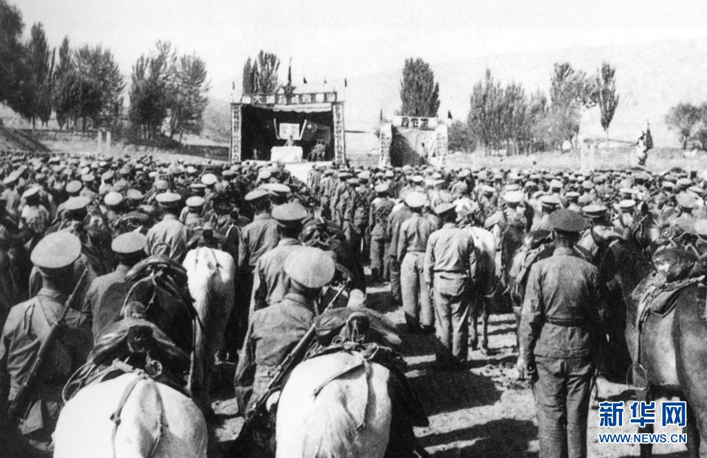獨立騎兵師一團在新疆于田縣普魯村召開進(jìn)藏誓師大會(資料照片)。新華社發(fā)(進(jìn)藏英雄先遣連紀(jì)念館供圖)
