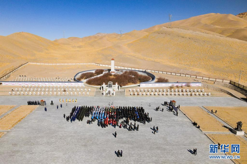清明時節(jié),西藏阿里的黨員干部、解放軍、學(xué)生及群眾,聚集獅泉河烈士陵園,祭奠英靈(2021年4月4日攝,無人機照片)。新華社記者 張兆基 攝