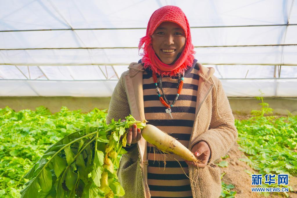 西藏阿里改則縣日瑪村村民央金在改則產(chǎn)業(yè)園蔬菜大棚展示收獲的蔬菜(2021年3月31日攝)。新華社記者 田金文 攝