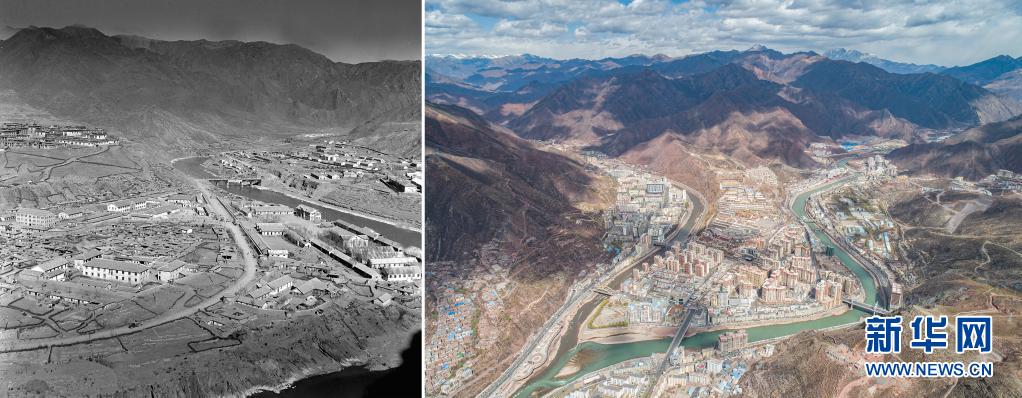 拼版照片:左圖是20世紀(jì)60年代的昌都市區(qū)一角(新華社記者任用昭攝);右圖是2021年3月25日拍攝的昌都市卡若區(qū)(新華社記者孫非攝,無人機照片)。新華社發(fā)