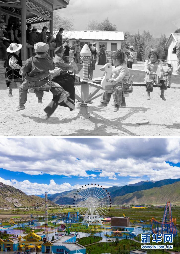 拼版照片:上圖是20世紀(jì)80年代,日喀則幼兒園的孩子們在玩動物圓盤轉(zhuǎn)椅(新華社記者程曦攝);下圖是2021年8月9日拍攝的拉薩市象雄美朵游樂園(新華社記者張汝鋒攝,無人機照片)。新華社發(fā)