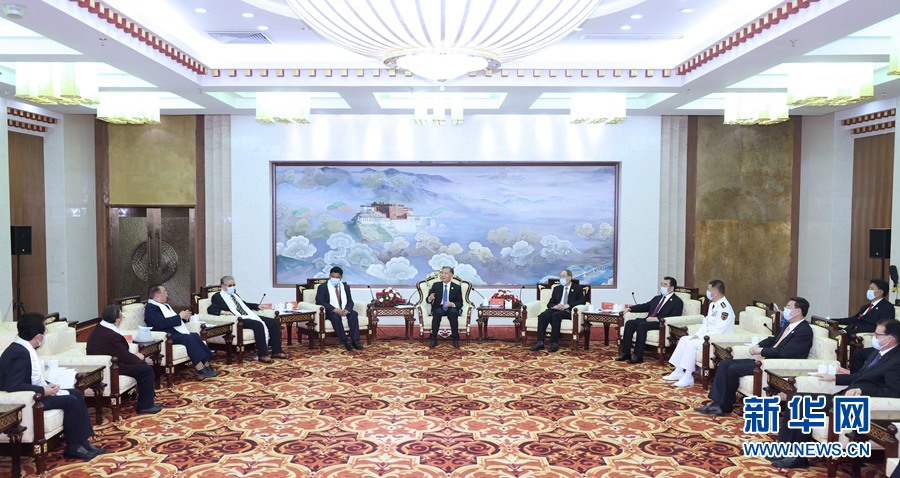 8月18日,以中共中央政治局常委、全國(guó)政協(xié)主席汪洋為團(tuán)長(zhǎng)的中央代表團(tuán)飛抵拉薩,出席西藏和平解放70周年慶?;顒?dòng)。受黨中央和習(xí)近平總書記委托,汪洋在拉薩飯店看望在藏領(lǐng)導(dǎo)干部、老同志白瑪赤林、帕巴拉·格列朗杰和列確、巴桑,以及阿沛·阿旺晉美同志家人代表,向他們表示親切問候。新華社記者 劉彬 攝