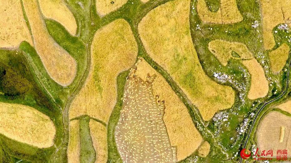 九月的西藏,已進(jìn)入青稞成熟收割時(shí)節(jié)。記者來(lái)到拉薩市曲水縣熱堆村,成片成片成熟了的青稞,金黃耀眼。村民們抓緊天氣晴好的時(shí)機(jī),互幫互助忙收割,確保顆粒歸倉(cāng)。地頭田間,有的已被割倒束成捆,也有的仍在迎風(fēng)搖曳,等待收割,村民們揮舞著鐮刀,將成熟的青稞收割、扎捆、然后堆砌成一排排整齊的青稞垛子,用拖拉機(jī)將青稞運(yùn)回家,再上架晾曬,看著沉甸甸的麥穗,聞著空氣中彌漫著沁人心脾的青稞香,村民們臉上露出了喜悅的微笑。無(wú)人機(jī)鳥瞰青稞田地。人民網(wǎng) 次仁羅布攝