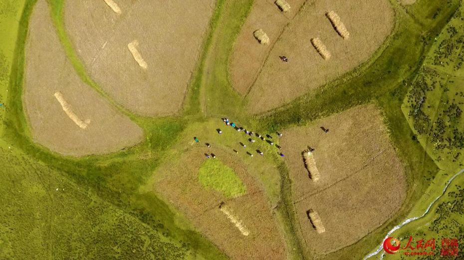 無(wú)人機(jī)鳥瞰田間整理捆扎好的青稞。人民網(wǎng) 次仁羅布攝