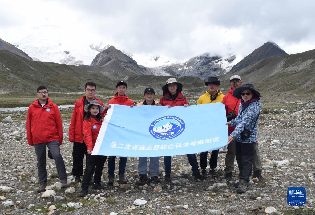8月24日,在西藏日喀則市區(qū)域內(nèi)的喜馬拉雅山脈一處雪山下,中科院地理科學(xué)與資源研究所客座教授李渝生(中)和年輕隊員們合影。 新華社記者 杜剛 攝