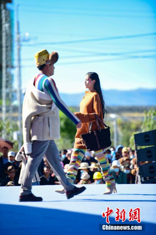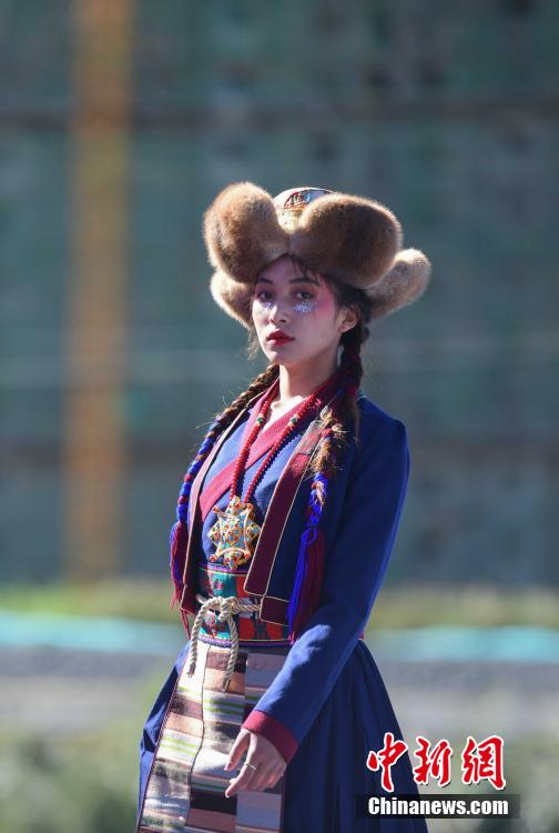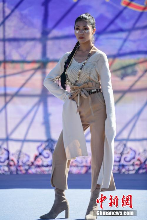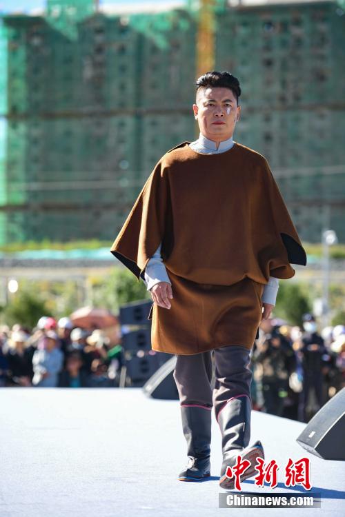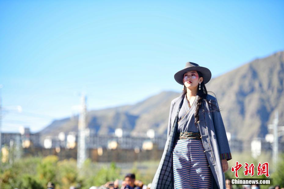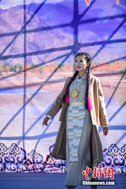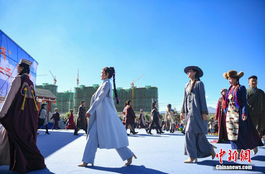 圖為當(dāng)?shù)夭刈迥L厣碇把鹏敳夭肌爆F(xiàn)代藏裝服飾進行走秀。貢嘎來松 攝