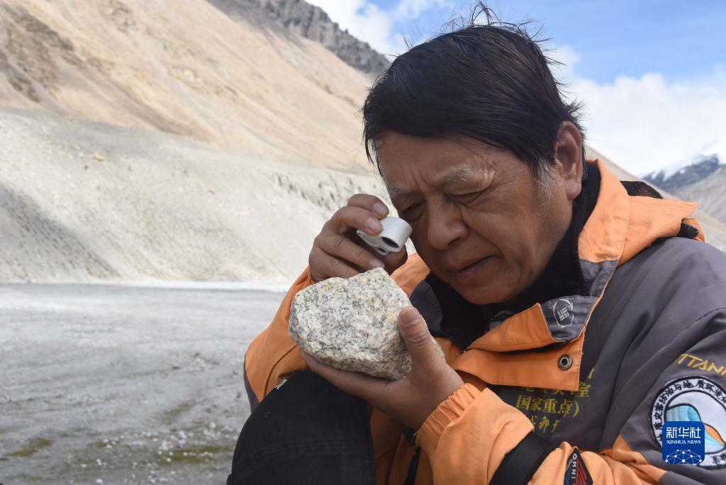 8月30日,在西藏日喀則市定日縣,中科院地理科學(xué)與資源研究所客座教授李渝生使用放大鏡觀察巖石。新華社記者 杜剛 攝