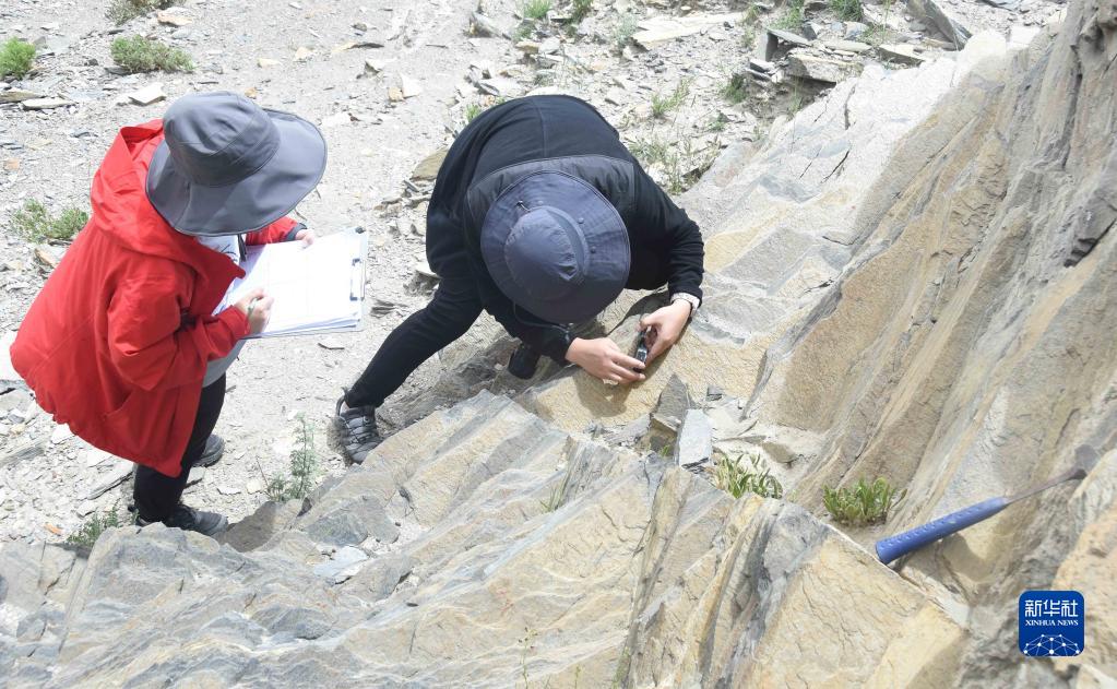 8月22日,在西藏日喀則市亞東縣一處山體,科考隊(duì)員使用羅盤,確定巖石的產(chǎn)出狀態(tài)和方位。新華社記者 杜剛 攝