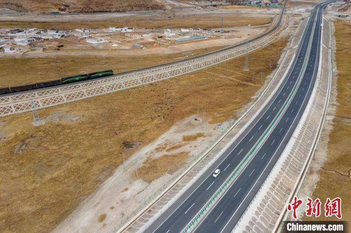 圖為一列進(jìn)藏火車經(jīng)過G6京藏高速西藏羊八井路段。 江飛波 攝