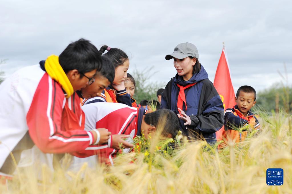 日喀則市上海實驗學校的學生們在青稞地里聽講解(9月17日攝)。新華社 潘杰 攝