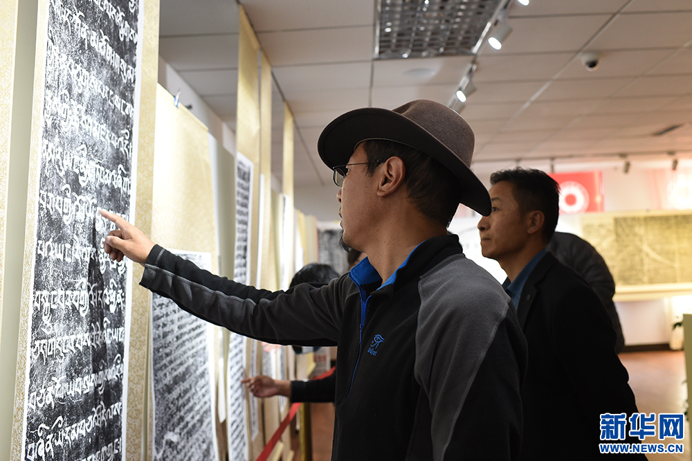 9月29日,在西藏大學(xué)新校區(qū)圖書館,參觀者觀賞石碑拓片內(nèi)容。新華網(wǎng) 旦增努布攝