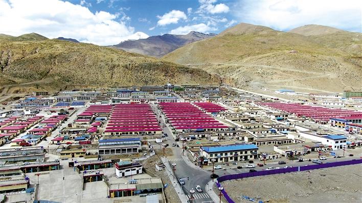 在這座現(xiàn)代化的小區(qū)里,一排排黃色的藏式民居整齊劃一,迎風(fēng)招展的五星紅旗格外醒目,小區(qū)周邊學(xué)校、醫(yī)院、農(nóng)貿(mào)市場(chǎng)等配套設(shè)施一應(yīng)俱全。沐浴著和煦的陽(yáng)光,孩子們?cè)谙镒永锉寂苕音[,老人們圍攏在一起拉家常。