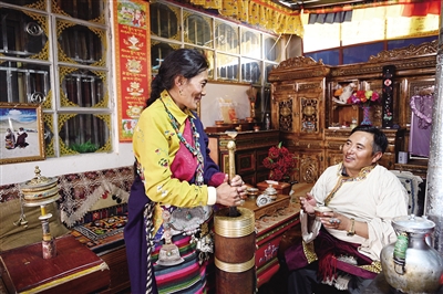 居住在阿里噶爾縣康樂新居的斯瓊正在品嘗妻子普珍制作的酥油茶。2017年,斯瓊一家從海拔4570米的改則縣麻米鄉(xiāng)搬入了噶爾縣生態(tài)安置小區(qū)康樂新居。據(jù)了解,根據(jù)西藏自治區(qū)黨委、政府的決策部署,當(dāng)?shù)卣畬0?700米以上極高海拔地區(qū)實施生態(tài)搬遷,實現(xiàn)群眾脫貧致富和生態(tài)環(huán)境改善。