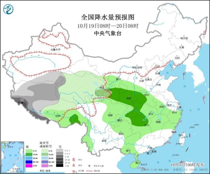 10月19日08時至20日08時,新疆東南部、西藏中西部、青海西部等地部分地區(qū)有小到中雪,其中,西藏西南部部分地區(qū)有大到暴雪(10~11毫米)。西藏東南部、甘肅南部、陜西中南部、山西南部、河南西南部、湖北西部、湖南北部等地部分地區(qū)有中雨(見圖3)。