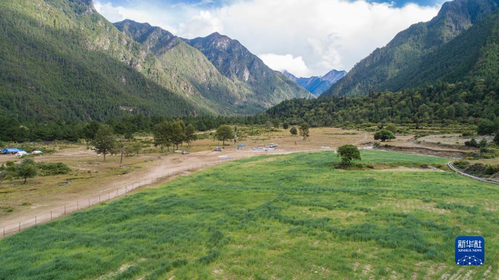 西藏林芝市米林縣,“綠哈達行動”中種植的人工草場郁郁蔥蔥(2020年9月13日攝,無人機照片)。 新華社記者孫非 攝