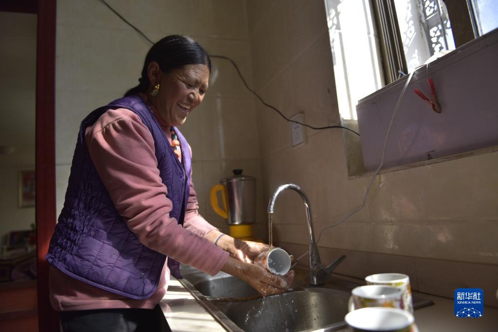 楚魯松杰鄉(xiāng)楚松村楚魯組村民強(qiáng)白桑姆用入戶(hù)自來(lái)水清洗茶碗(2021年9月18日攝)。新華社記者 格桑朗杰 攝
