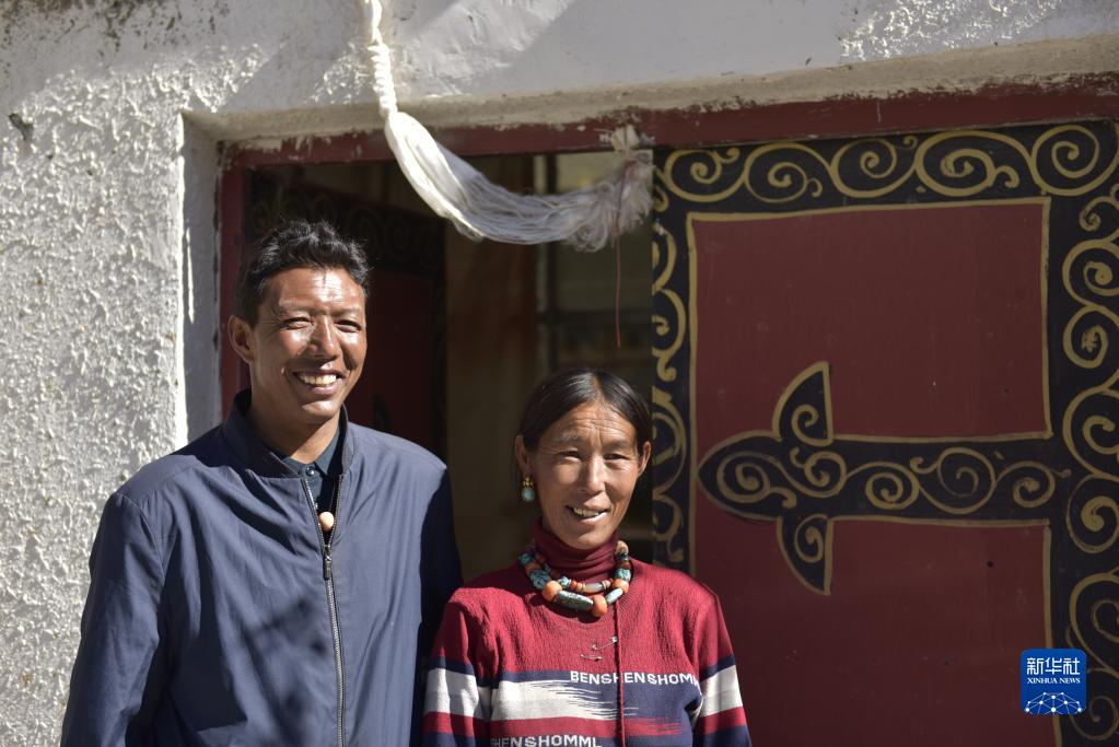 楚魯松杰鄉(xiāng)巴卡村巴角組村民歐珠多吉與妻子在新房門(mén)前合影(2021年9月19日攝)。新華社記者 格桑朗杰 攝