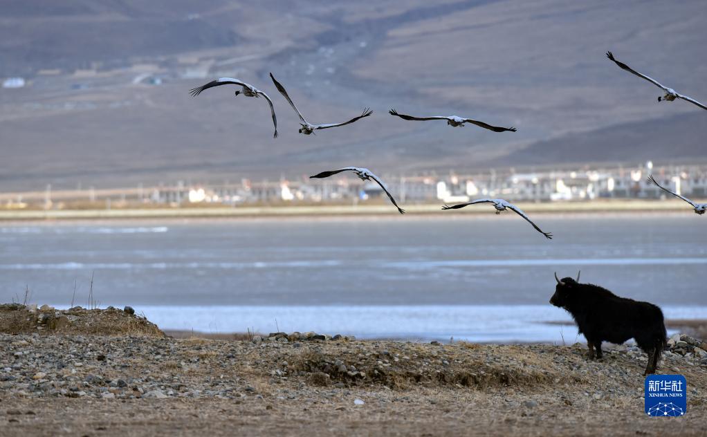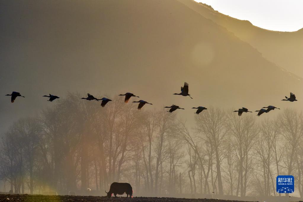 黑頸鶴在拉薩市林周縣黑頸鶴自然保護(hù)區(qū)飛翔(1月8日攝)。新華社記者 張汝鋒 攝