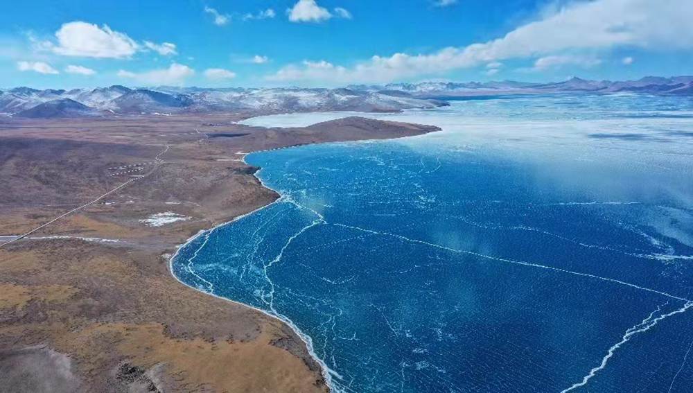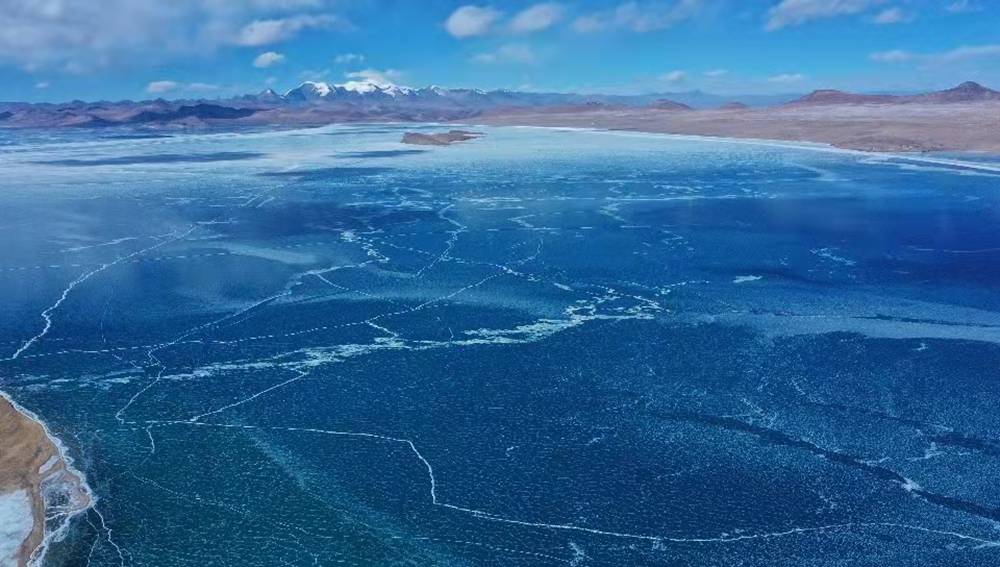 位于西藏山南市洛扎縣和浪卡子縣交界處的普莫雍錯,是喜馬拉雅山脈間的一個咸水湖,湖面海拔5070m。冬季的普莫雍錯湖面會結冰,冰面通透可見湖底,在陽光的照射下,呈現(xiàn)出動人心魄的藍。