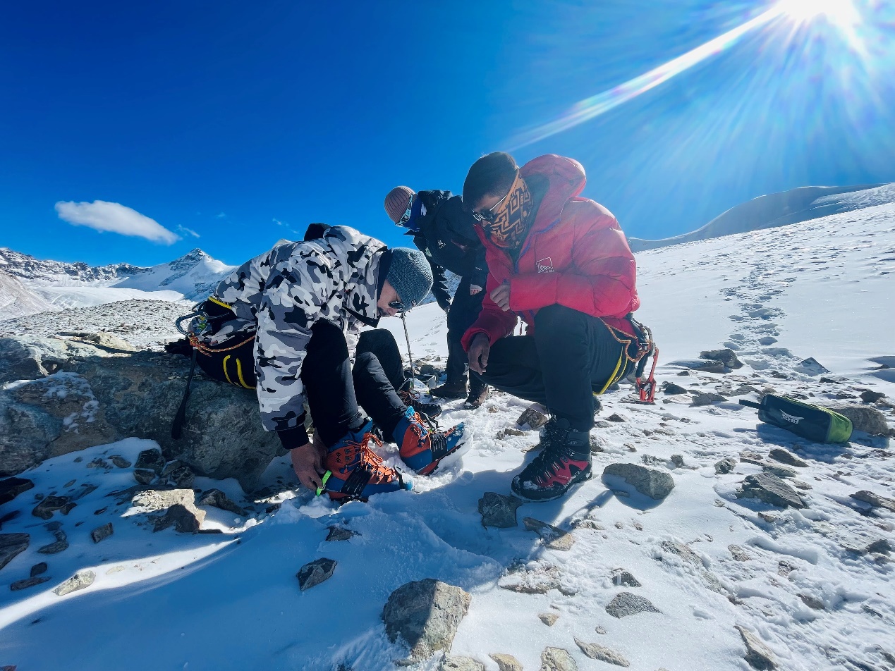 抵達(dá)洛堆峰5600米雪線的位置,三位二十歲出頭的年輕人熟練地在積雪冰壁上打起冰錐,固定路繩,他們?cè)诮o這些遠(yuǎn)道而來(lái)的體驗(yàn)者設(shè)置技能訓(xùn)練路線。