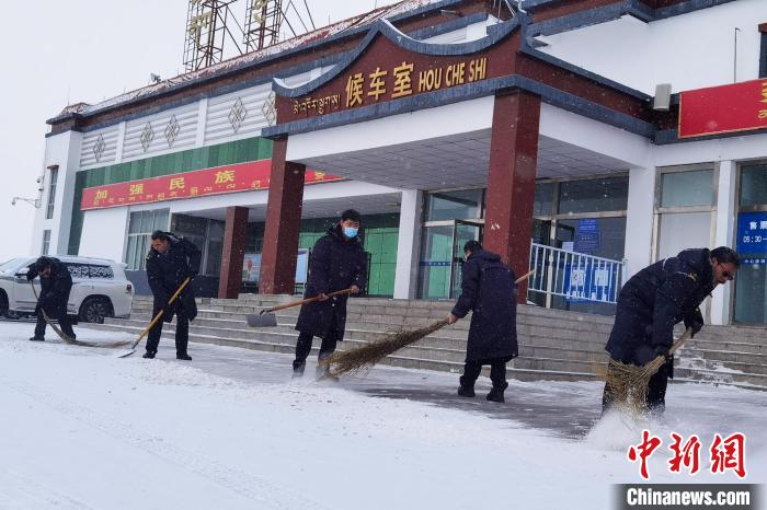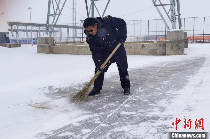 那曲火車站工作人員掃雪保障旅客出行安全。王志先 攝