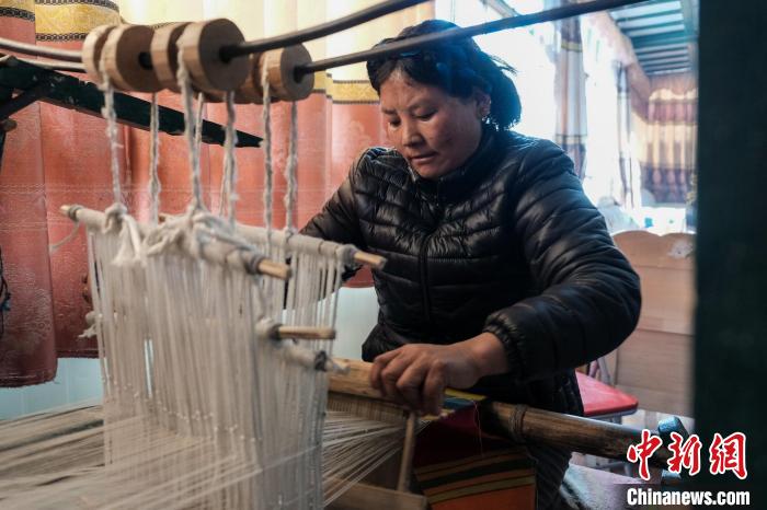 在他們家,記者看到了幾臺傳統(tǒng)藏式織機(jī),玉珍說,這是用于織邦典(藏式毛織圍裙)的工具。2016年開始,玉珍運(yùn)用編織技藝帶領(lǐng)村里的婦女共同成立了一個小規(guī)模的編織廠,“我們的羊毛線是自己染的,織出來的邦典質(zhì)感更好,也不愁銷路,為家里增收不少。”她說,編織讓大家實現(xiàn)了家門口就業(yè),也不耽誤家務(wù),村里人很樂于接受。