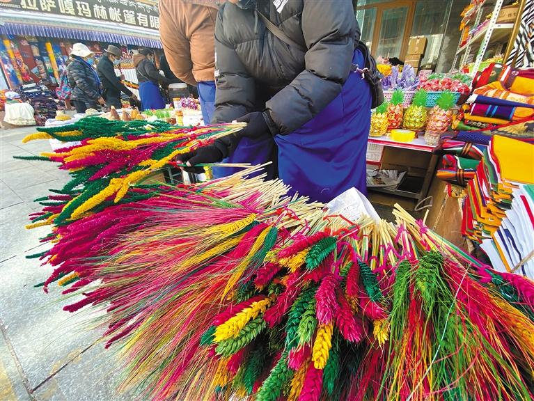 堆龍德慶區(qū)桑木社區(qū)五組,家家戶戶都會(huì)制作“羅薩美朵”并在藏歷新年前售賣?!啊_薩美朵’是一種經(jīng)過染色、手工制作、色彩各異的麥穗狀花朵,每年春季播種,金秋時(shí)節(jié)收獲,懸掛風(fēng)干,完好保存。到了藏歷11月,采購染色的顏料和捆扎用的毛線繩,把早已收割晾曬好的‘羅薩美朵’拿出來,為其染色、捆扎,然后拿到市區(qū)進(jìn)行銷售?!鄙D旧鐓^(qū)五組居民達(dá)珍告訴記者。