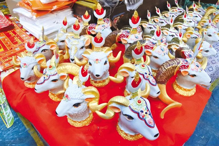 “隆果”也只在藏歷新年前出售,是藏歷新年必備的年貨之一,從新年的初一到十五期間擺放在家里,其余時(shí)間,即便是在常年熱鬧的沖賽康市場(chǎng)也很難尋見,所以當(dāng)看到塑彩羊頭時(shí),也就代表年關(guān)將至。