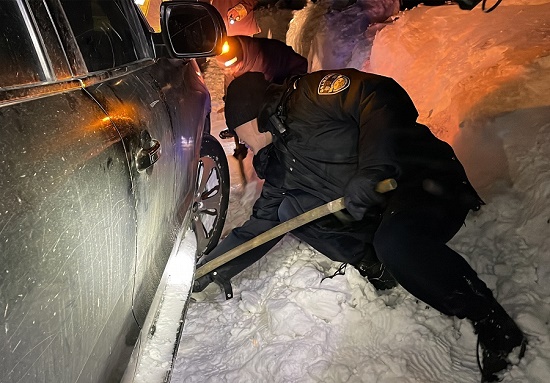 在到達(dá)現(xiàn)場(chǎng)后,救援民警立即為早已凍得瑟瑟發(fā)抖的被困人員送上了熱水和防寒大衣,并安撫了被困人員情緒。在勘察了現(xiàn)場(chǎng)的情況后,救援民警一邊用鐵鍬和雙手迅速清理車(chē)輛底盤(pán)的厚冰,一邊用牽引繩嘗試將被困車(chē)輛進(jìn)行拉出,因積雪太厚嘗試多次未能成功,隨后,協(xié)調(diào)到朗縣養(yǎng)護(hù)段一輛推土機(jī),經(jīng)過(guò)一個(gè)小時(shí)救援,被困車(chē)輛成功被拖出。被困人員救出來(lái)后,為了確保車(chē)輛人員的絕對(duì)安全,金東邊境派出所救援民警全力護(hù)送被困人員于晚上11點(diǎn)45分安全抵達(dá)單位營(yíng)區(qū),救援工作取得圓滿成功。