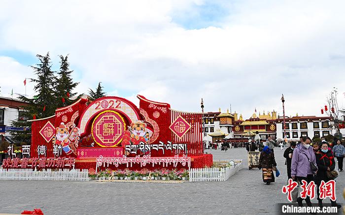 2月26日,人們經(jīng)過大昭寺廣場擺放著的慶祝新年裝置。隨著藏歷新年日益臨近,拉薩街頭年味濃郁。 中新社記者 趙朗 攝