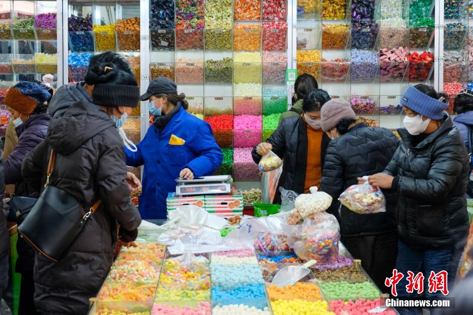 目前正值藏歷12月下旬,西藏即將迎來傳統(tǒng)藏歷水虎新年,拉薩民眾也全面進入“藏歷新年時間”。2月27日下午,小新在西藏最大的傳統(tǒng)綜合市場——拉薩沖賽康市場周邊看到,羅薩美朵、卡塞、酥油、切瑪盒、糖果、干果、藏式服裝等年貨琳瑯滿目,購買的市民也進入“最后”的采購時間,市場周圍人群絡繹不絕,高原迎春、年味十足。圖為一商販在拉薩沖賽康市場周邊銷售藏歷新年年貨“褪”。江飛波 攝